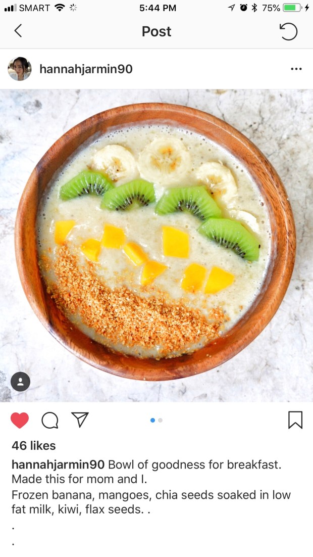 @hannahjarmin90 had this bowl of goodness filled with frozen bananas, mangoes, chia seeds soaked in low fat milk, kiwis, and flax seeds.