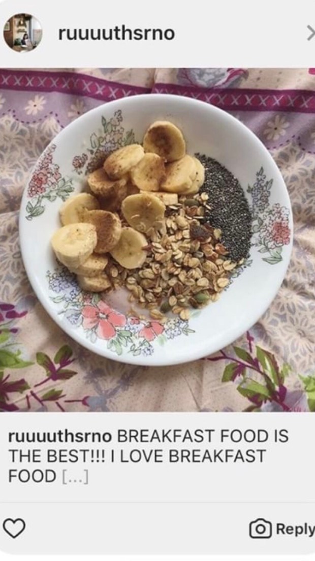 @ruuuuthsrno has the right idea – breakfast food IS the best. Her bowl had chia seeds, granola, bananas, flax seeds, and Greek yogurt.