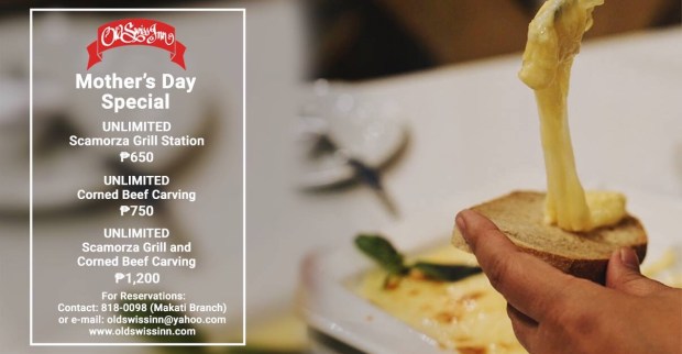 This Mother’s Day May 12, Sunday, @oldswissinn features our Smoked Scamorza. Enjoy unlimited melted Smoked Scamorza only for P650/pax for lunch and dinner. They’re also featuring a Fresh Corned Beef Station. Email oldswissinn@yahoo.com or call 8188251 to inquire. #mothersday